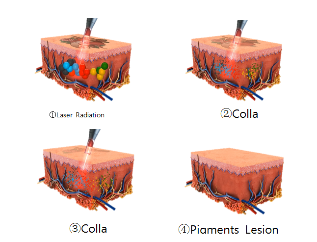 | Treatment Theory | High focused 1064nm/532nm laser transfer energy instantly to target lesion within 8ns pulse width and results in an instant pigmentation blasting. The tiny pigmentation particles are shattered into fragments ,some fragments in the epidermis will be removed directly and deep tiny fragments in the dermis will be absorbed by phagocytes and then eliminated by lymphatic system, so achieve the best result for pigmentation removal. |